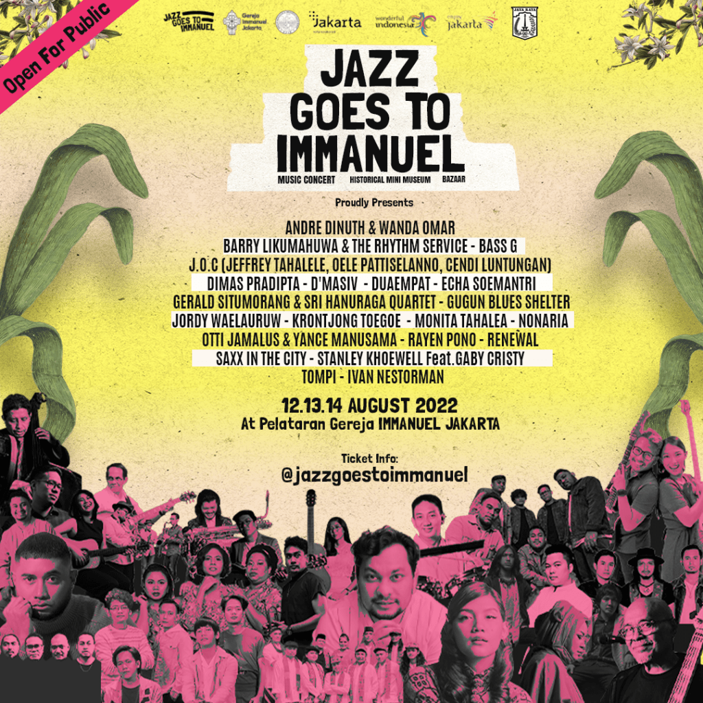 LewatLensa.com – Konser amal Jazz Goes To Immanuel akan digelar pada tanggal 12, 13, dan 14 Agustus 2022 di Halaman Gedung Gereja Immanuel Jakarta. Acara ini mengundang total 20 musisi Jazz tanah air. Musisi yang akan tampil adalah Andre Dinuth & Wanda Omar, Barry Likumahuwa & The Rhythm Service, Bass G, J.O.C (Jeffrey Tahalele, Oele Pattiselano, Cendi Luntungan), Dimas Pradipta, D’Masiv, DuaEmpat, Echa Soemantri Ft. Tompi, Gerald Situmorang & Sri Hanuraga Quartet, Gugun Blues Shelter, Jordy Waelauruw, Krontjong Toegoe, Monita Tahalea, NonaRia, Otti Jamalus & Yance Manusama, Rayen Pono, Renewal, Saxx In The City, Stanley Khoewell feat. Gaby Cristy, Ivan Nestorman. Acara ini juga akan dikemas dengan pameran Historical Mini Museum dan Bazaar.