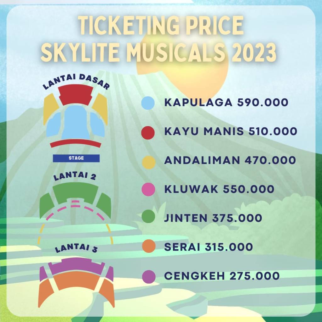 Tiket dijual mulai dari kisaran Rp200.000,- hingga Rp500.000,- dengan kursi terbatas. Penonton dapat memilih kursi terbaiknya untuk melihat pertunjukan spektakuler dari Skylite Musicals 2023 “KELANA”.
