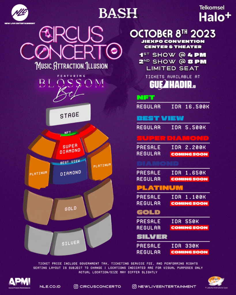 Tiket tersedia dengan cara pre-register melalui gerai resmi tiket box di guehadir.id mulai tanggal 21 Agustus 2023. Pastikan untuk mendapatkan tiketnya sebelum kehabisan, karena Circus Concerto featuring Blossom BCL ini akan menjadi acara musik dan hiburan paling ditunggu tahun ini.