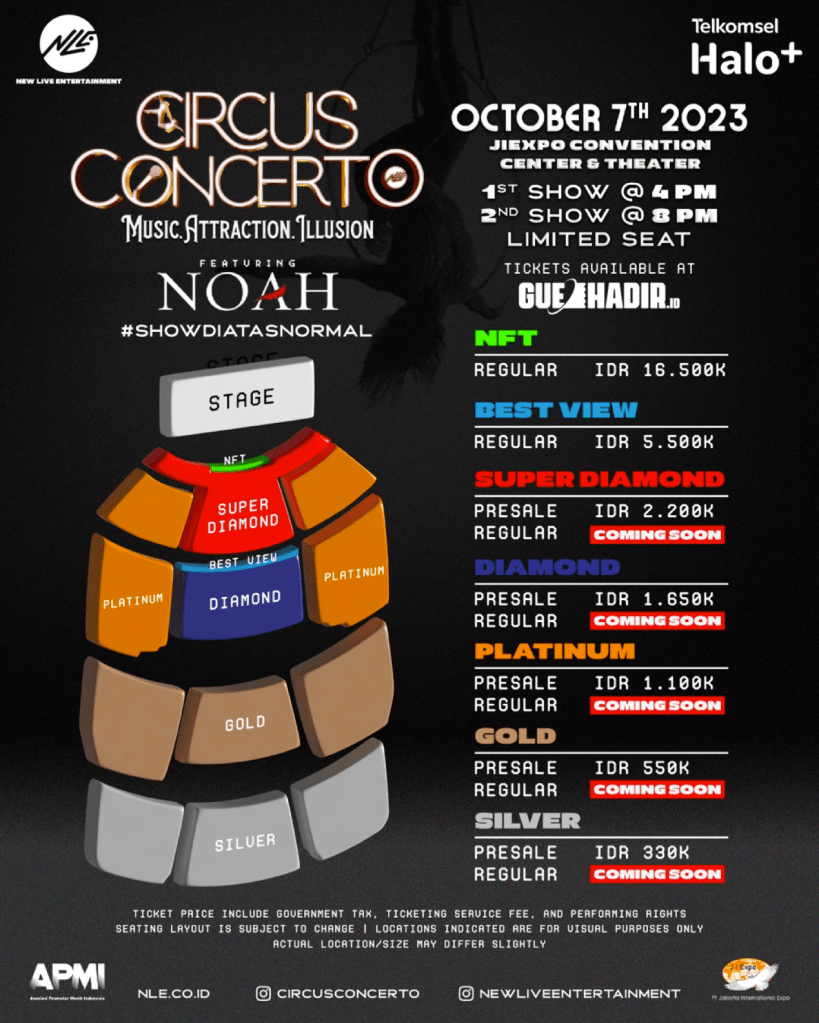 Selain kontribusi performing rights, hal penting lainnya dari New Live Entertainment yang perlu diketahui adalah mengenai harga dan kelas kategori tiket untuk menyaksikan konser musik Circus Concerto featuring NOAH, tersedia 7 kelas kategori tiket mulai dari kelas terendah Silver, Gold, Platinum, Diamond, Super Diamond, Best View dan NFT.