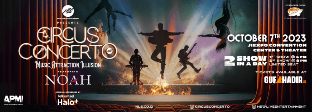 LewatLensa.com – New Live Entertainment dengan bangga mempersembahkan acara terbaru, hasil karya anak negeri dengan konsep acara yang original pertama kali di Indonesia, yang akan memukau para pecinta musik dan penggemar atraksi yang menantang dengan tajuk konser “Circus Concerto” yang adalah acara konser musik yang akan menampilkan tiga segmen sebagai pilar acara yaitu: Music, Attraction, Illusion dalam satu acara sekaligus, hadir bersama dengan grup musik terbaik tanah air “NOAH”. New Live Entertainment mempersembahkan Circus Concerto featuring NOAH, didukung oleh the official sponsor: Telkomsel Halo+. Sebuah konser yang tak hanya menampilkan musik berkualitas tinggi, tetapi juga atraksi panggung yang memukau dengan ilusi yang spektakuler dalam satu panggung yang megah dengan #ShowDiAtasNormal, Sabtu, 7 Oktober 2023 di JIEXPO Convention Centre & Theater dengan 2 jadwal show, Sore pukul 16.00 WIB dan Malam pukul 20.00 WIB.
