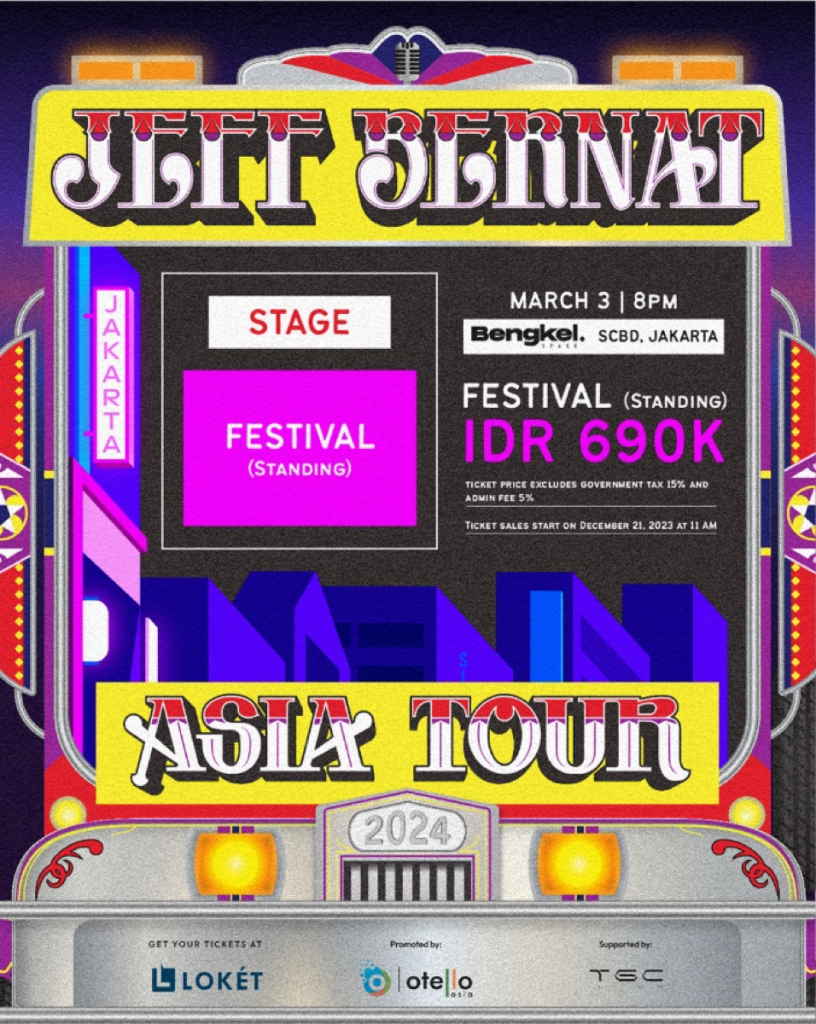 That’s right, folks! Setelah pertama kali bertandang ke Indonesia pada 2019, Jeff Bernat akhirnya akan kembali datang ke Tanah Air untuk menggelar konser Asia Tour pertamanya sekaligus merupakan konser tunggal pertamanya bertajuk “Asia Tour 2024”, yang akan digelar di Bengkel Space, SCBD, Jakarta, 3 Maret 2024.