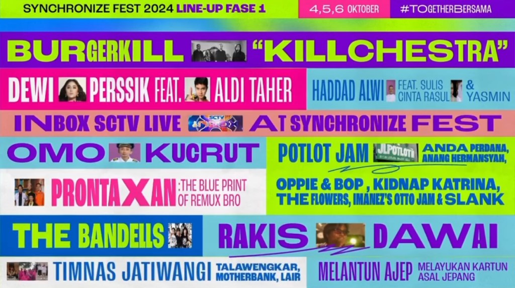 LewatLensa.com – Beberapa waktu lalu Synchronize Fest memastikan diri tanggal perhelatan akbarnya di tahun 2024 yang jatuh pada tanggal 4, 5, 6 Oktober 2024 dengan tema #TogetherBersama. Kali ini kabar gembira datang lagi bersama dengan diumumkannya 10 nama lineup penampil fase pertama Synchronize Fest yang akan tampil di 2024.