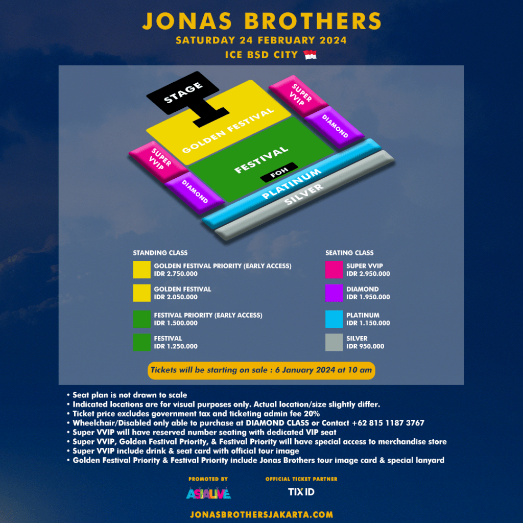 Berikut informasi harga tiket dan denah/layout untuk konser Jonas Brothers di Indonesia: