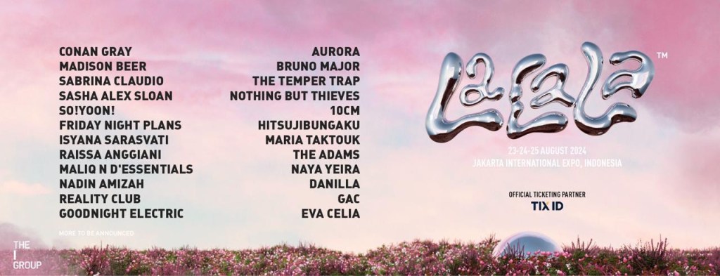 LaLaLa dengan bangga mengumumkan lineup pertamanya yang menampilkan deretan nama sensasi internasional – Conan Gray, Madison Beer, Bruno Major, The Temper Trap, Sabrina Claudio, Aurora, dan banyak lagi. Tidak hanya itu, LaLaLa terus juga menampilkan campuran eklektik bakat internasional dan lokal. Bergabung dengan lineup yang spektakuler adalah Isyana Sarasvati, Maliq D’Essentials, Nadin Amizah, dan lainnya. Ini hanya sekilas dari perjalanan musikal luar biasa yang menanti para pengunjung karena LaLaLa 2024 menjual tiketnya mulai dari Rp1,3juta untuk 3 hari.