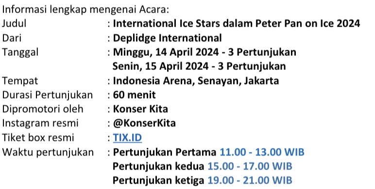 Pihak promotor Konser Kita akan menghadirkan total 6 (enam) Shows selama 2 hari di Jakarta untuk “The International Ice Stars dalam Peter Pan on Ice 2024“, yang akan memukau para penonton pada waktu Libur Idul Fitri 2024 pada hari Minggu hingga Senin, 14-15 April 2024 di Indonesia Arena, Senayan Jakarta.