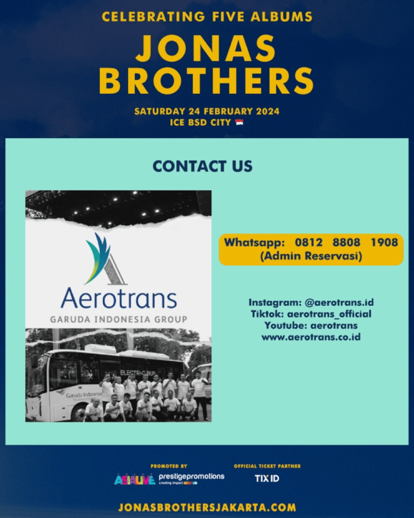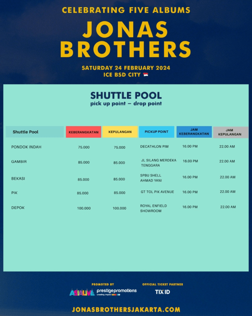Pihak penyelenggara bekerja sama dengan sarana transportasi Aerotrans – Exclusive Shuttle Bus menyediakan transportasi shuttle bus berbayar untuk memudahkan para penonton konser Jonas Brothers The Tour 2024 di Indonesia, datang & nonton lebih aman dan nyaman tersedia Exclusive Shuttle Bus yang berangkat dari 5 Lokasi strategis mulai dari Pondok Indah, Gambir, Bekasi, PIK dan Depok, dengan jadwal keberangkatan dari lokasi penjemputan Pickup Point pukul 16.00 WIB dan jadwal kepulangan dari lokasi acara pukul 22.00 WIB dengan kisaran harga mulai dari Rp. 75.000.- sampai Rp 100.000.- untuk sekali jalan.