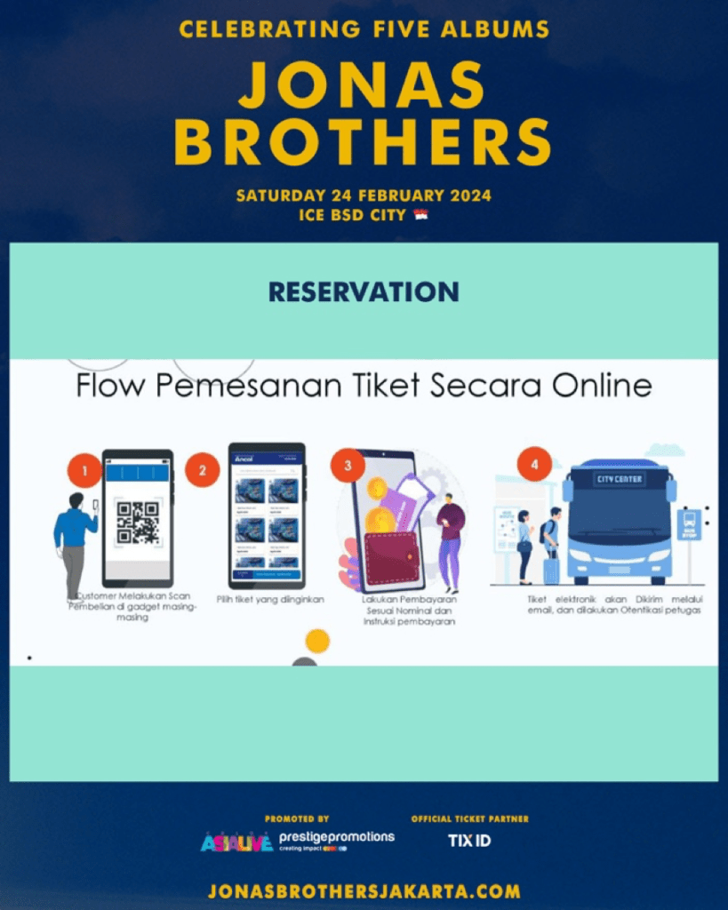 – Tiket dapat dibeli secara online melalui website https://www.jonasbrothersjakarta.com/ataupun melalui Aplikasi TIX ID.