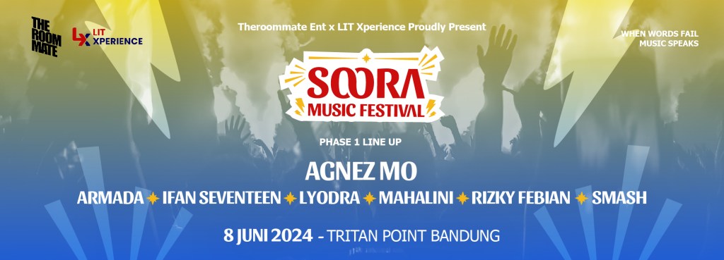 LewatLensa.com – Pihak Penyelenggara The RoomMate & LIT Experience dengan bangga mengumumkan penyelenggaraan festival musik spektakuler tahun ini di Kota Bandung, “SOORA Music Festival 2024” – The Most Exciting Music Festival 2024. Acara ini akan berlangsung pada hari Sabtu, 8 Juni 2024, di lokasi ikonik Tritan Point Bandung.