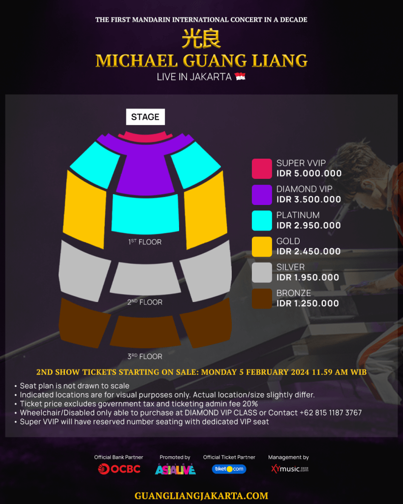Untuk itu, sambung David Ananda, bagi para fans Michael Guang Liang yang belum kebagian tiket untuk show hari kedua, berikut kami sampaikan seatplan konser ‘First Time’ Michael Guang Liang yang bisa didapatkan melalui laman www.guangliangjakarta.com dan aplikasi Tiket.com :