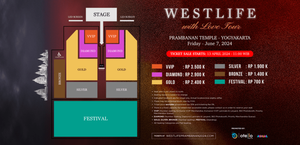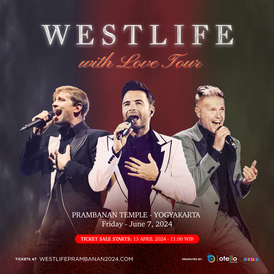 Penjualan tiket umum tersedia mulai hari Sabtu, 13 April 2024, hanya melalui www.WestlifePrambanan2024.com pukul 11.00 WIB