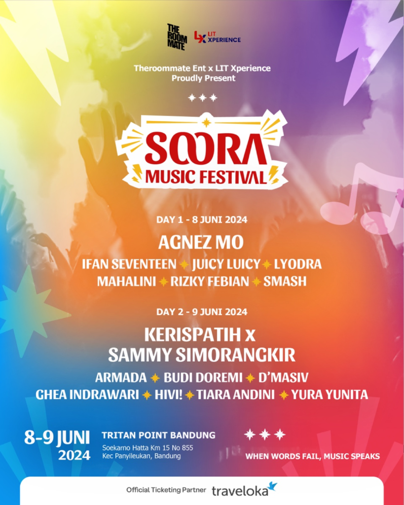 SOORA Music Festival 2024 – When Words Fail, Music Speaks diharapkan akan menjadi destinasi hiburan penting bagi komunitas musik Indonesia yang ada di Kota Bandung, hadir menyuguhkan hiburan musik populer dengan suasana yang menyenangkan.