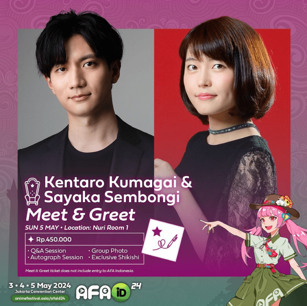 Meet & Greet bersama Kentaro Kumagai dan Sayaka Sembongi! Ikuti sesi tanya jawab eksklusif dan dapatkan shikishi bertanda tangan serta foto bersama!