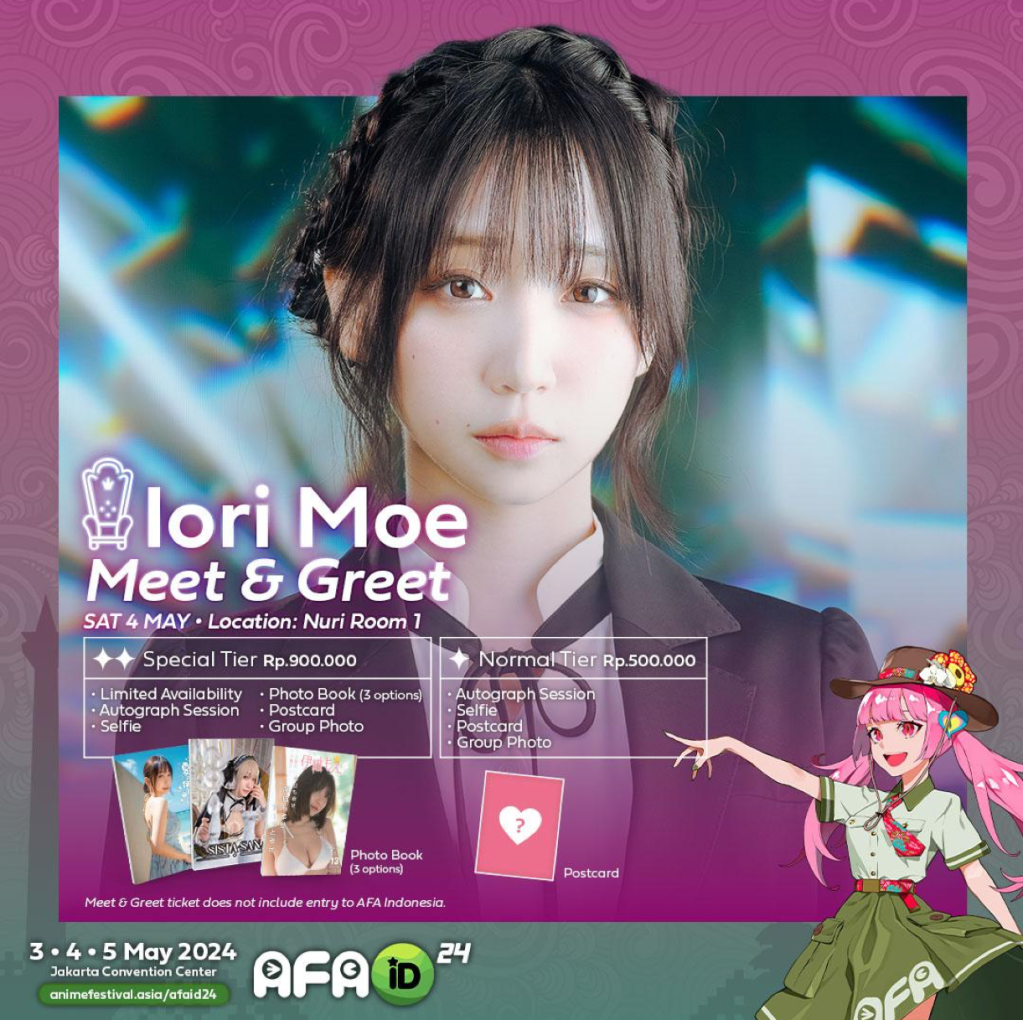 Tampil di AFA Indonesia 2024 adalah tokoh media Jepang, Iori Moe! Iori memiliki total 4,55 juta pengikut di media sosial, telah muncul di sampul lebih dari 130 majalah Jepang, dan sangat populer sebagai streamer videogame.