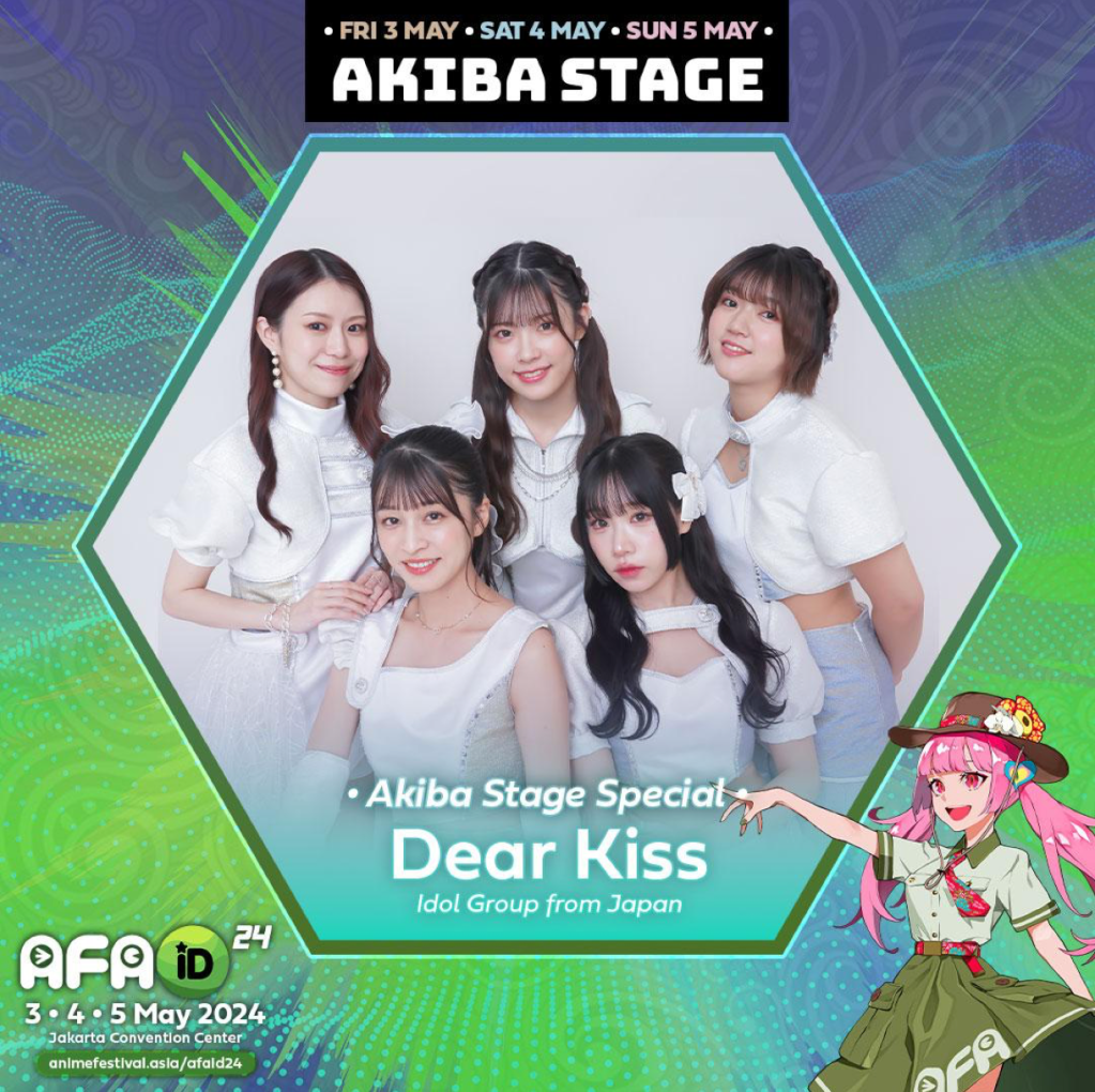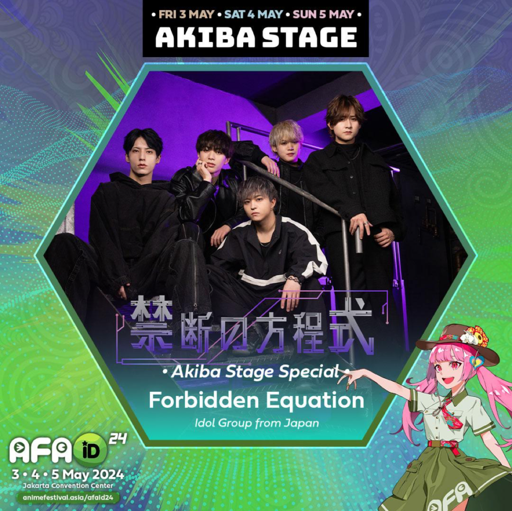 Di Akiba Stage, jangan lewatkan penampilan DEAR KISS dan Forbidden Equation! Saksikan penampilan live yang menarik dari DEARKISS – grup tari dan vokal wanita langsung dari Jepang, yang juga populer di luar negeri! Bergabung dengan mereka di atas panggung di Indonesia, mereka adalah grup idola pria yang sedang naik daun, Forbidden Equation! Tunjukkan dukungan Anda kepada para idola ini dengan membeli merchandise resmi mereka di booth Pameran mereka!
