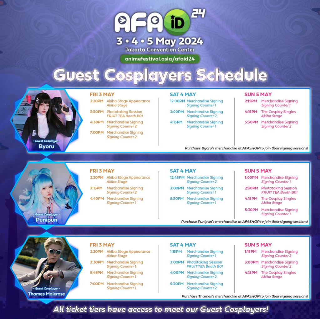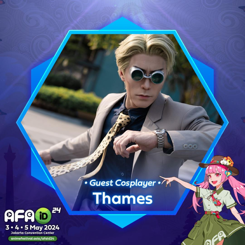 Bergabung bersama AFA ID sebagai Bintang tamu Cosplayer adalah Thames Malerose! Thames Malerose adalah seorang cosplayer veteran dari Thailand yang kemampuannya yang luar biasa membawanya menjadi juara ke-3 di World Cosplay Summit 2022 di Jepang (bersama rekannya Jasper Z). Para penggemarnya masih tidak pernah puas dengan kostumnya yang memukau dan ketampanannya yang menawan!