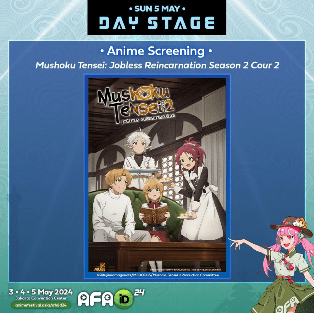 Di acara Day Stage, jangan lewatkan Mushoku Tensei: Jobless Reincarnation! Saksikan pemutaran spesial Mushoku Tensei: Jobless Reincarnation Season 2 Cour 2! Pria yang dulunya menjalani hidupnya seperti sampah, kini telah menjadi seorang anak laki-laki bernama Rudeus, dan bersumpah bahwa dia akan memberikan usaha terbaiknya dalam kehidupan di isekai ini!
