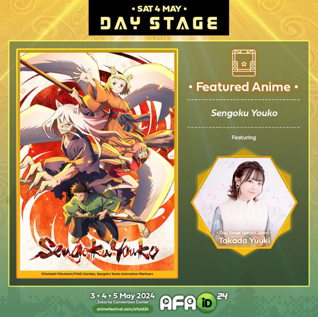 Di acara Day Stage, jangan lewatkan Sengoku Youko – dengan talkshow spesial yang menampilkan pengisi suara Takada Yuuki! Tama adalah roh rubah yang mencintai manusia, sementara saudara laki-lakinya, Jinka, membenci manusia. Bersama-sama, mereka menggunakan kekuatan transformasi roh untuk mengalahkan katawara yang mengerikan dan mengakhiri kejahatan di zaman yang kacau ini. Seperti apakah takdir yang menanti keduanya di akhir perjalanan mereka?