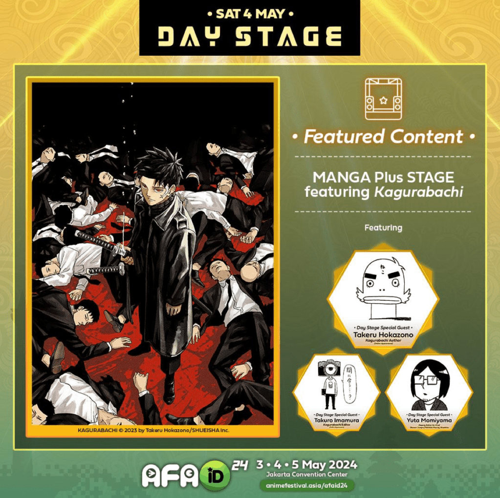 Di acara Day Stage, jangan lewatkan MANGA Plus STAGE yang menampilkan Kagurabachi! Nikmati aksi pertarungan pedang yang epik dengan bincang-bincang khusus oleh Penulis Kagurabachi Takeru Hokazono (penampilan online), Editor Kagurabachi Takuro Imamura (penampilan online), dan Wakil Pemimpin Redaksi Shonen Jump+ / MANGA Plus oleh Shueisha Yuta Momiyama!