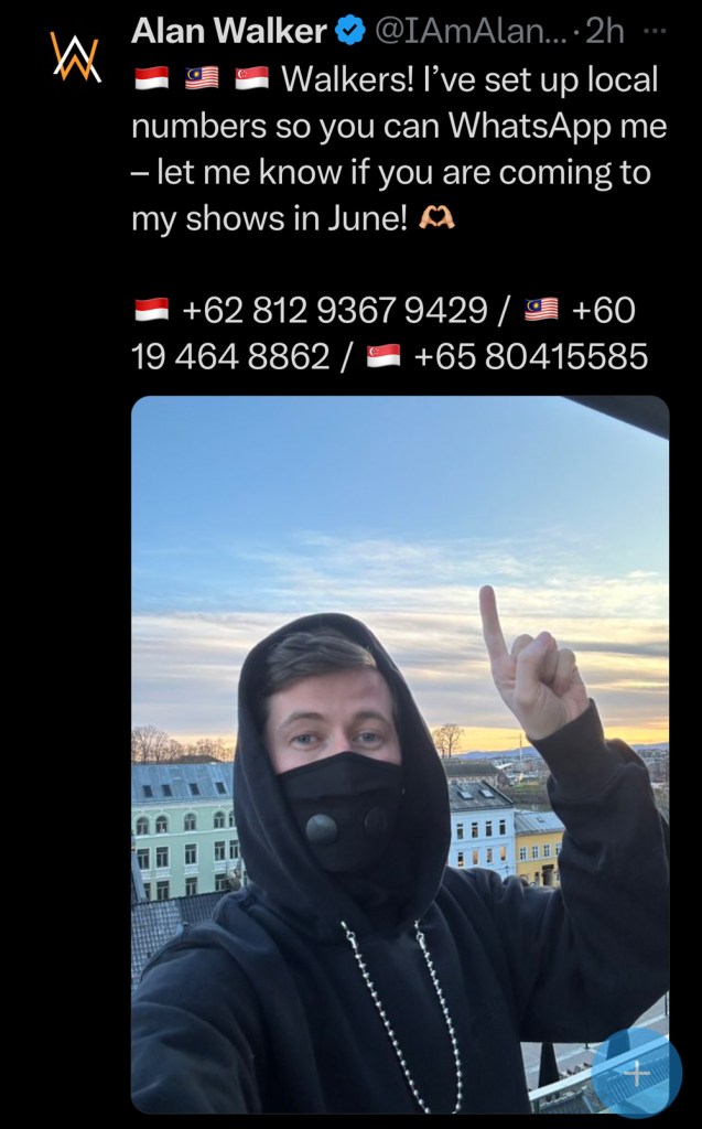 Alan Walker, terkenal dengan lagu-lagu hitsnya yang banyak digemari seperti “Faded“, “Alone” dan yang terbaru “Who I Am ft. Putri Ariani dan Peder Elias“, bersiaplah untuk pertunjukan Walkerworld-nya di Jakarta pada tanggal 8 Juni sebagai bagian dari Walkerworld Asia Tour Pt. I. Untuk menambah kemeriahannya nanti, ia memposting nomor telepon Indonesia di media sosial dan mengajak para penggemarnya untuk mengirim pesan lewat WhatsApp kepadanya menjelang pertunjukan. Alan Walker mengungkapkan: ” 🇮🇩Walkers! Saya telah menyiapkan nomor lokal sehingga anda semua dapat menghubungi saya melalui pesan WhatsApp – beri tahu saya jika anda semua akan datang ke pertunjukan saya nanti di bulan Juni di nomor WA: +62-812 9367 9429