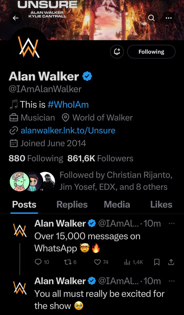 Menjelang Pertunjukannya di Jakarta, Alan Walker Minta Penggemar Kirim Pesan Langsung Lewat nomor WhatsApp-nya.