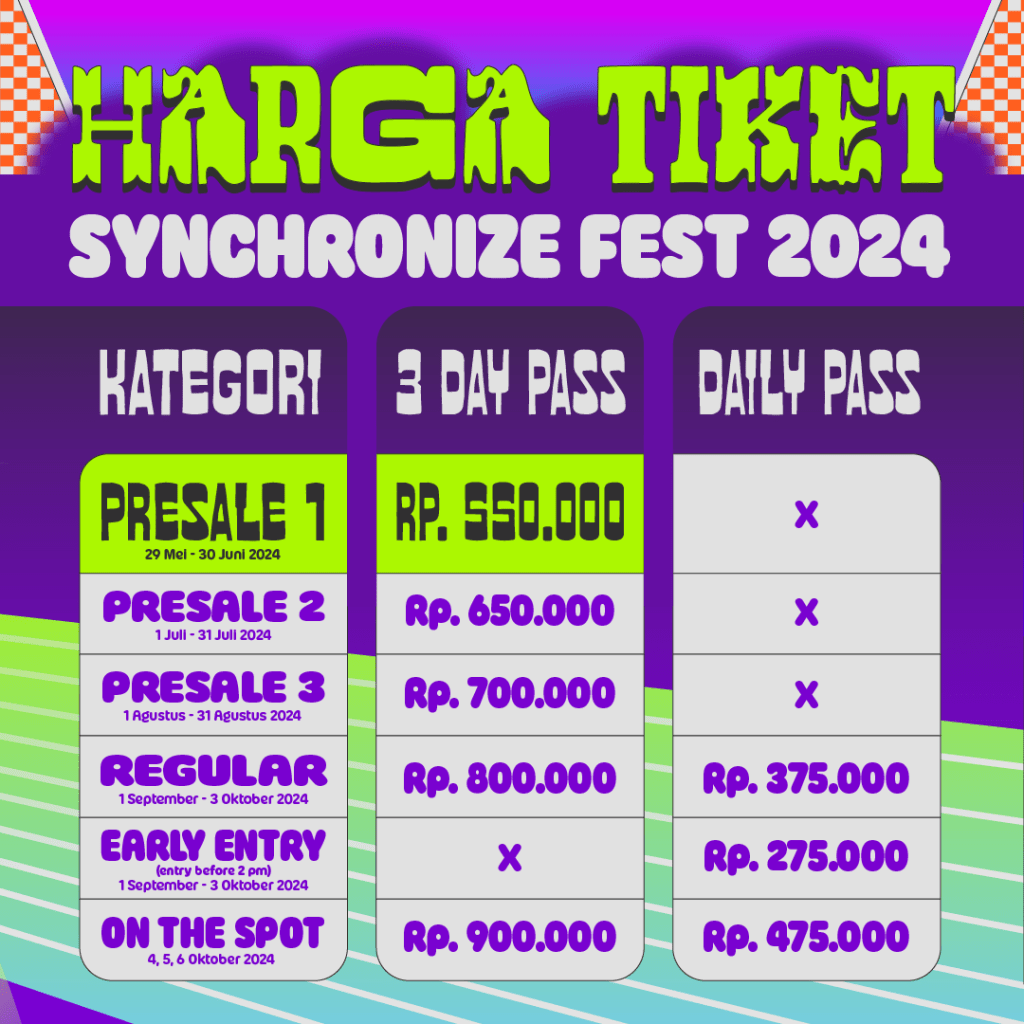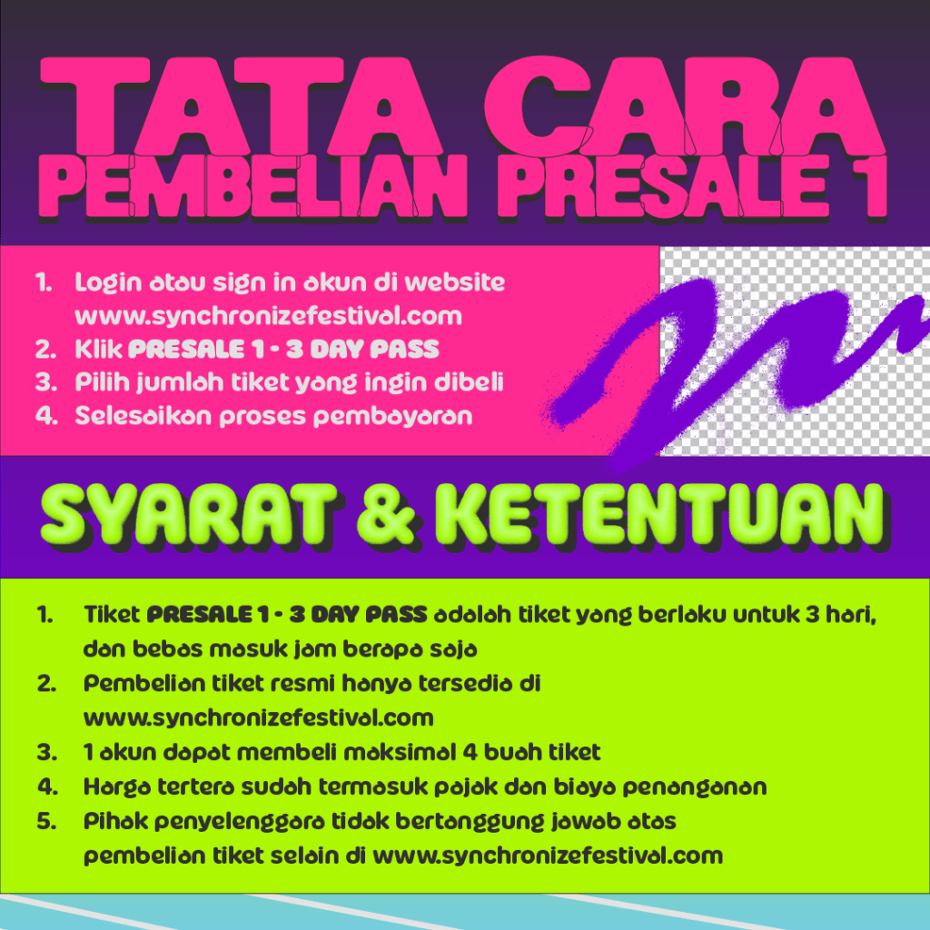 Di saat yang bersamaan, Synchronize Fest juga mulai melakukan penjualan tiket 3 DAY PASS – PRESALE 1 seharga Rp. 550.000 (sudah termasuk pajak dan biaya penanganan) yang mulai dijual pada tanggal 29 Mei 2024 – 30 Juni 2024 melalui website http://www.synchronizefestival.com.