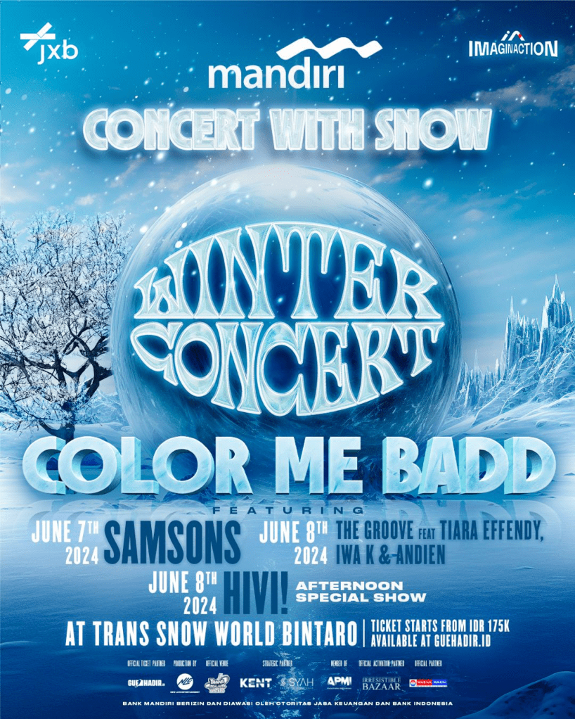 LewatLensa.com – Sabtu, 8 Juni 2024 – Hari Kedua “Winter Concert” di Trans Snow World Bintaro. Diselenggarakan oleh Jakarta Experience Board (JXB) dengan dengan original creative concept dan produksi oleh ImaginAction, “Winter Concert” kembali berlanjut pada hari kedua. Setelah suksesnya pertunjukan pembuka dengan SAMSONS dan Color Me Badd pada Jumat malam, konser pada hari Sabtu, 8 Juni 2024 ini akan kembali mempersembahkan sederet musisi internasional dan nasional. Pengunjung akan disuguhkan penampilan dari Color Me Badd, The Groove yang berkolaborasi dengan Tiara Effendy, Andien Aisyah, Iwa K, dan penampilan spesial dari HiVi! dalam Afternoon Special Show sore ini.