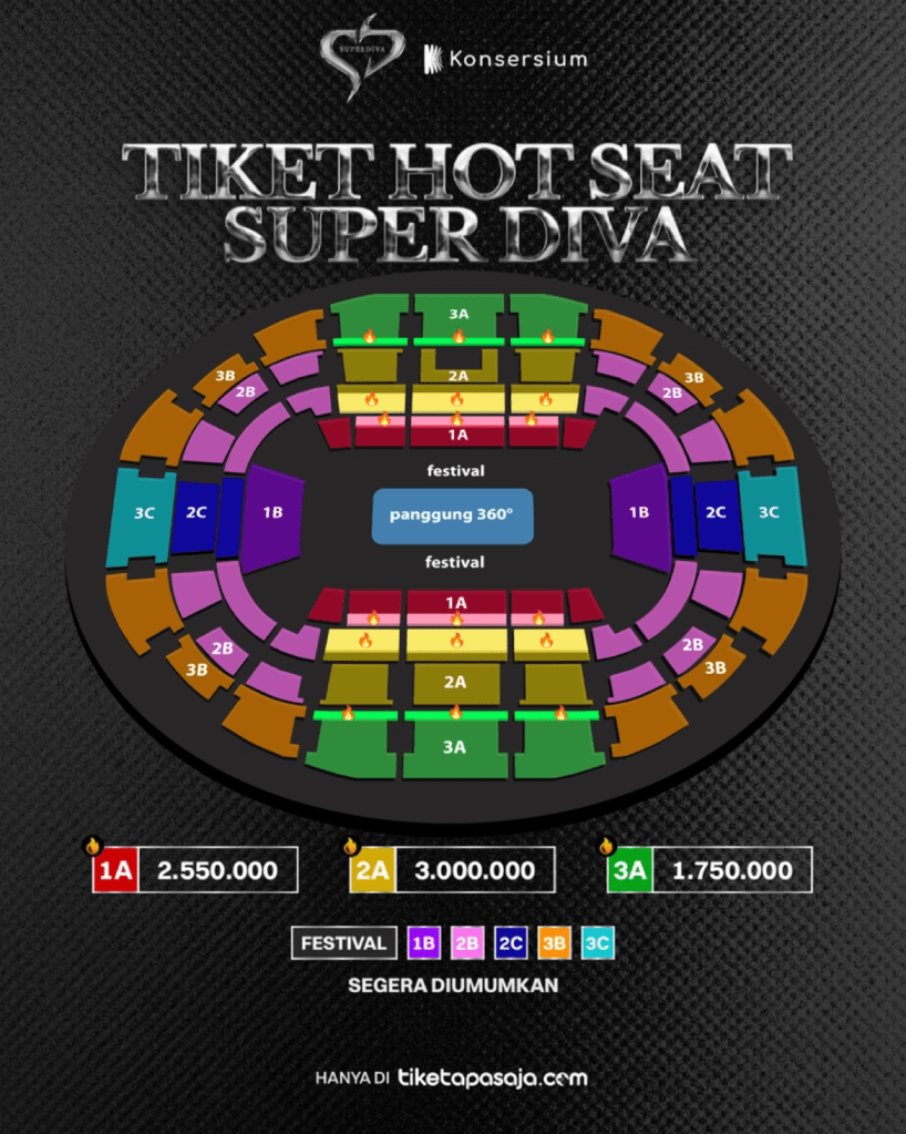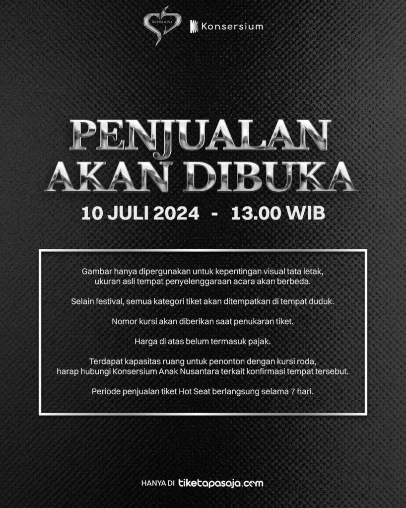Dapatkan kesempatan terbatas untuk merasakan energi kolaborasi spektakuler dan pengalaman musik yang intim dengan membeli tiket Hot Seat. Perlu diketahui bahwa tiket sangat terbatas! Periode penjualan hanya 7 hari saja, penjualan tiket Hot Seat terhitung mulai pada 10 Juli 2024 mulai pukul 13.00 WIB hanya di tiketapasaja.com, sedangkan tiket regular akan tersedia mulai 25 Juli 2024. Siap-siap untuk membeli tiket terbatas Hot Seat ini dan pastikan anda semua tidak kehilangan kesempatan untuk menyaksikan SUPER DIVA yang menakjubkan ini dari barisan paling ‘Hot Seat’.