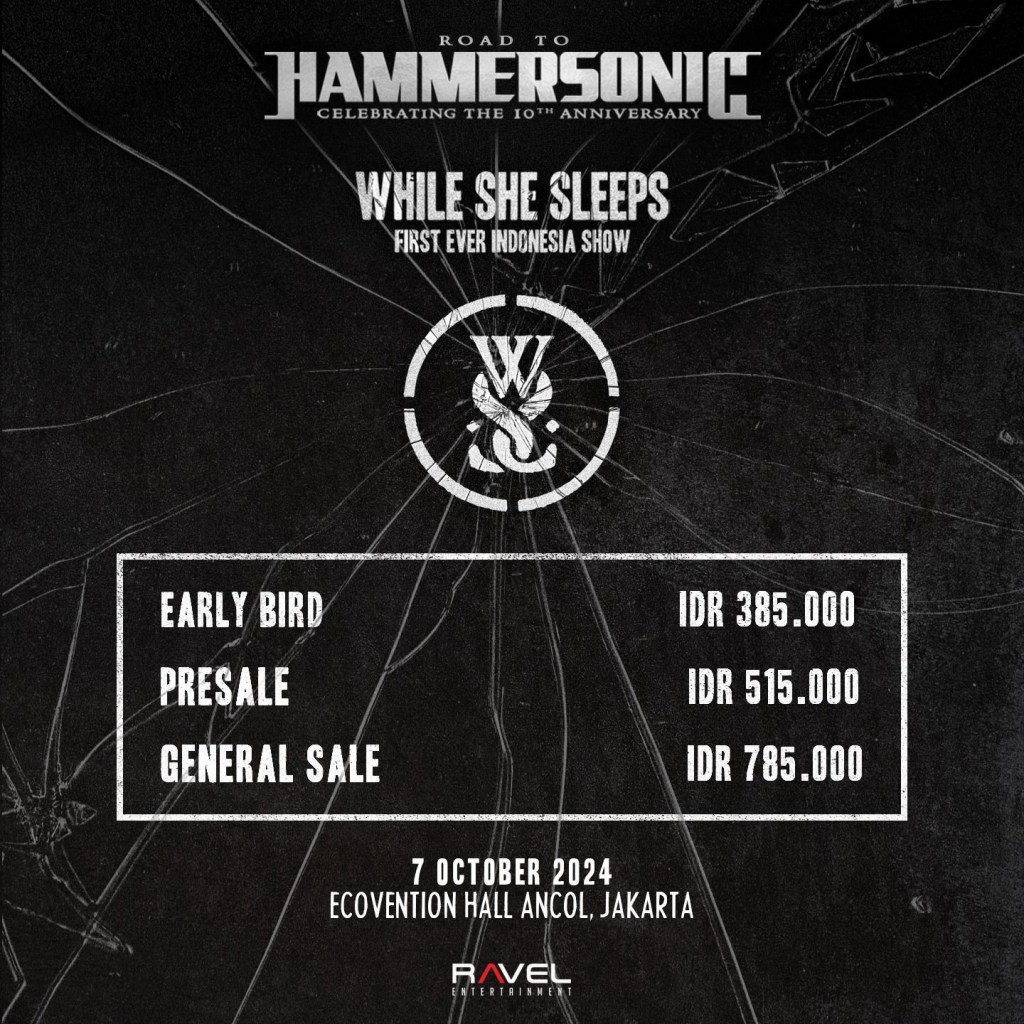 Acara Road to Hammersonic Celebrating 10th Anniversary with While She Sleeps akan diselenggarakan di Econvention Ancol pada 7 Oktober 2024. Tiket sudah dijual mulai tanggal 8 Agustus 2024 dan dapat dibeli melalui http://www.hammersonic.com dengan harga :