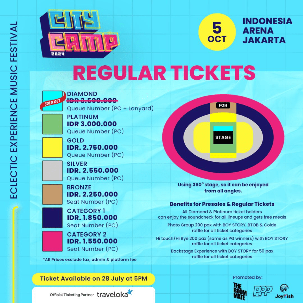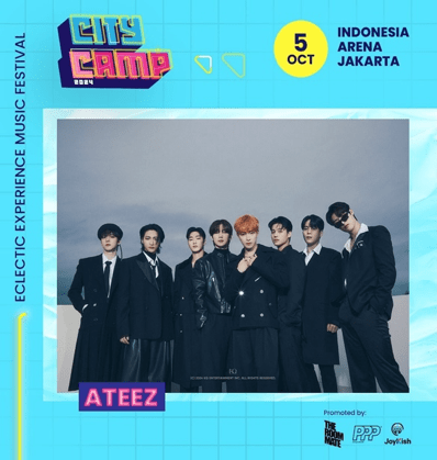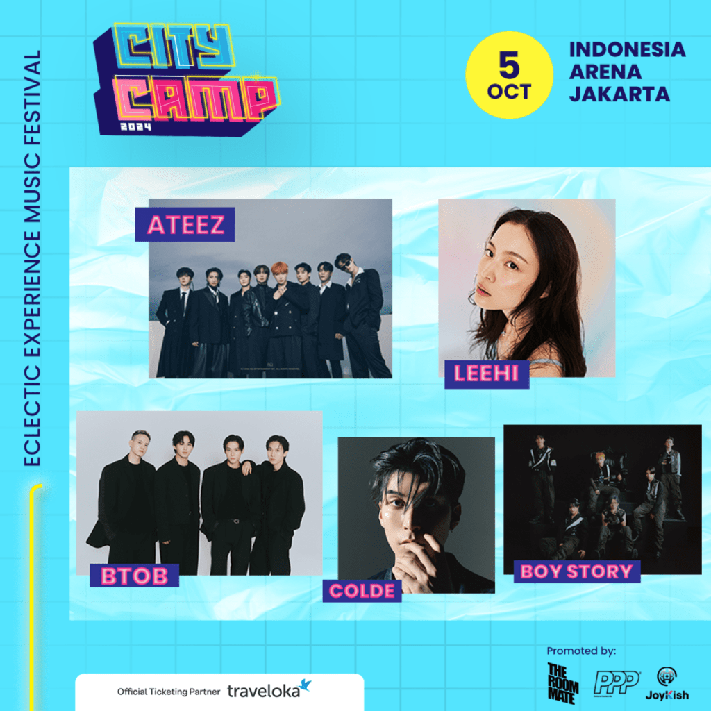 Bergabunglah dengan City Camp 2024 dan saksikan kemeriahan festival musik yang akan membawa anda ke dalam perjalanan musikal eklektik yang menyenangkan. Jangan lewatkan kesempatan untuk menyaksikan penampilan terbaik dari artis-artis favorit ATEEZ, BToB, Boy Story, COLDE. dengan suasana yang seru & menyenangkan di Sabtu, 5 Oktober 2024 di Indonesia Arena, Senayan Jakarta.