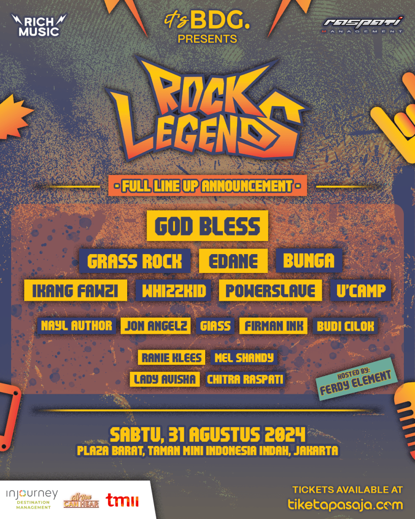 Dipromotori oleh BDG yang juga berkolaborasi dengan Rich Music dan Raspati Management, Rock Legends Festival menggaet sederet nama besar seperti Godbless, Ikang Fawzi, Grass Rock, Bunga, dan nama lain untuk memeriahkan titik pertama Rock Legends Festival di Plaza Barat, Taman Mini Indonesia Indah, Jakarta, pada 31 Agustus 2024.