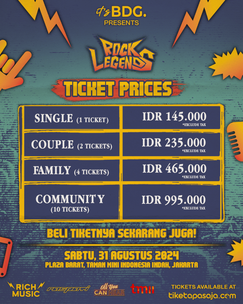 Mengingat tren selalu berputar, bukan tidak mungkin musik rock era tahun ’80 sampai ’90-an ini juga akan dinikmati oleh generasi muda bahkan sampai Gen Z. Untuk itu, tersedia tiket berbagai kategori yang bisa kalian dapatkan via tiketapasaja.com.