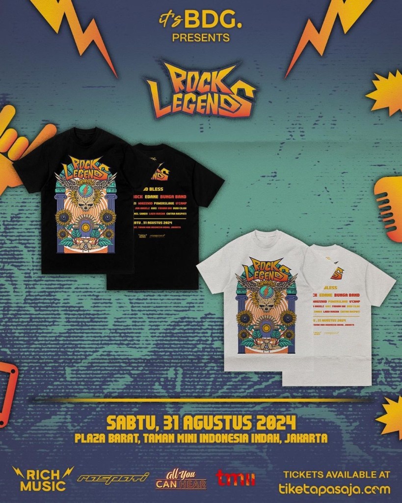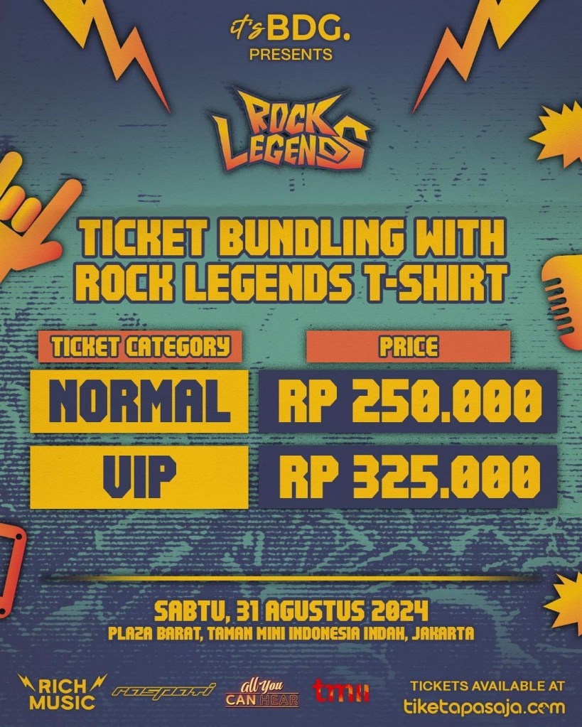 Gak cuma itu, kalau kalian pengen bawa oleh-oleh merchandise eksklusif dari Rock Legends Festival, kalian bisa beli tiket bundling (Rock Legends Tshirt + Ticket) seharga Rp. 250 ribu buat kategori Normal, dan Rp. 325 ribu untuk kategori VIP. Banyak untungnya kan? Makanya buruan sikat sebelum kehabisan!