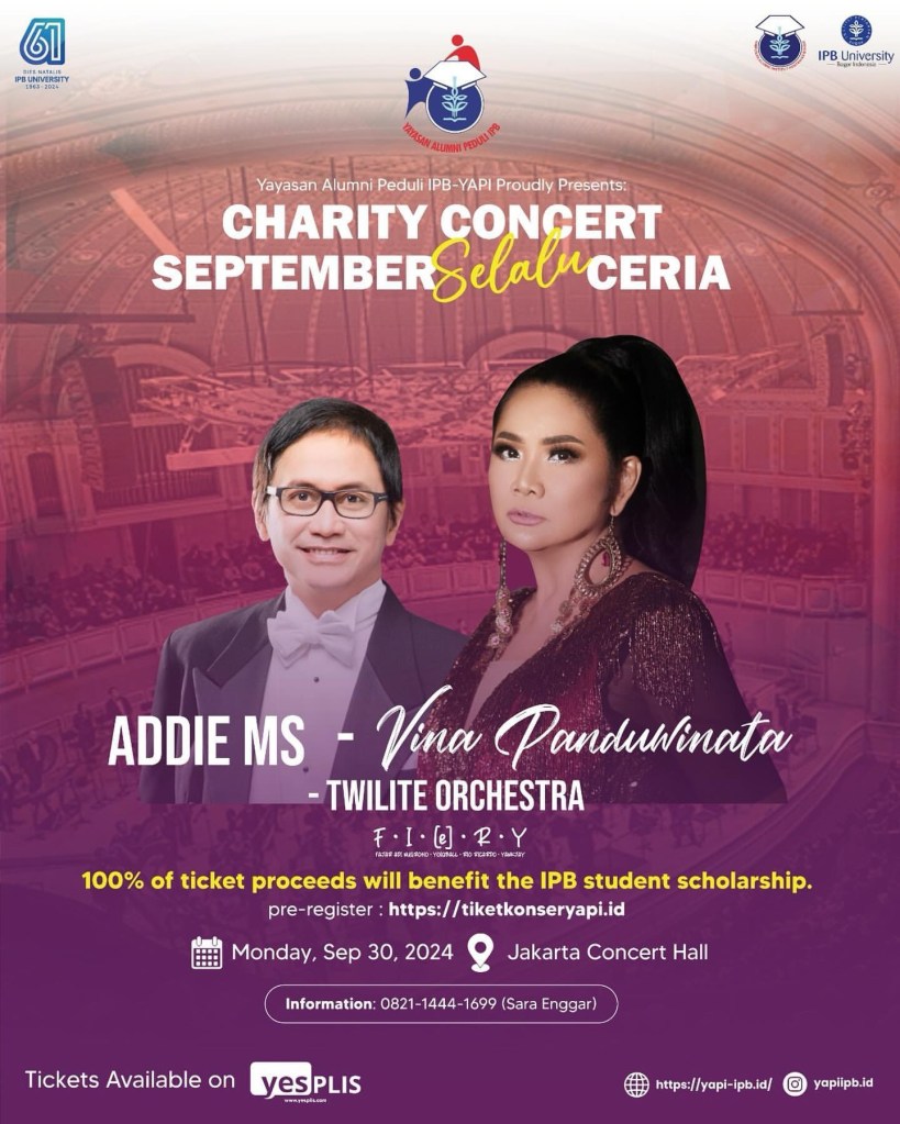 Hadir dalam kesempatan tersebut Ketua Umum YAPI Andi Irman Patiroi, Wakil Ketua Umum YAPI Nelly Owsini, Ketua Pelaksana Konser Tjandra Wibowo, Rektor IPB University Arif Satria, Addie MS, dan Vina Panduwinata.