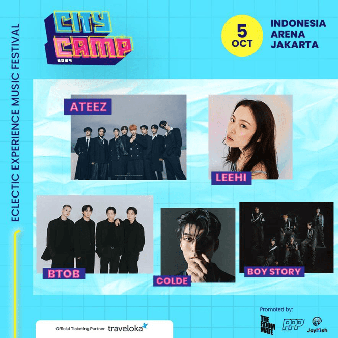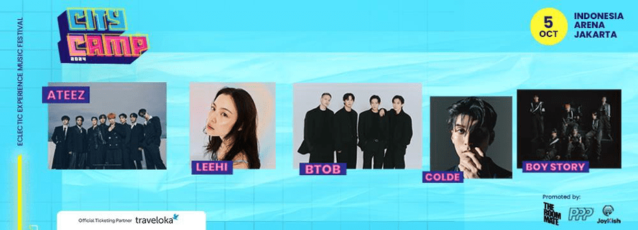 Bergabunglah dengan City Camp 2024 dan saksikan kemeriahan festival musik yang akan membawa anda ke dalam perjalanan musikal eklektik yang menyenangkan. Jangan lewatkan kesempatan untuk menyaksikan penampilan terbaik dari artis-artis favorit ATEEZ, BToB, Boy Story, COLDE & Lee Hi. dengan suasana yang seru & menyenangkan di Sabtu, 5 Oktober 2024 di Indonesia Arena, Senayan Jakarta.