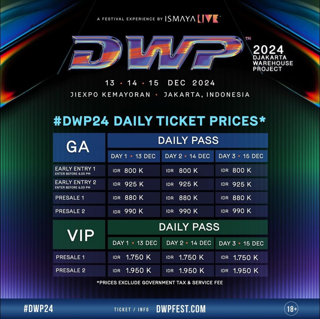 Pengunjung yang ingin menikmati #DWP24 selama tiga hari juga dapat membeli tiket dengan pilihan GA 3-day pass atau VIP 3-day pass. Harga tiket belum termasuk pajak dan akan terus diperbarui.
