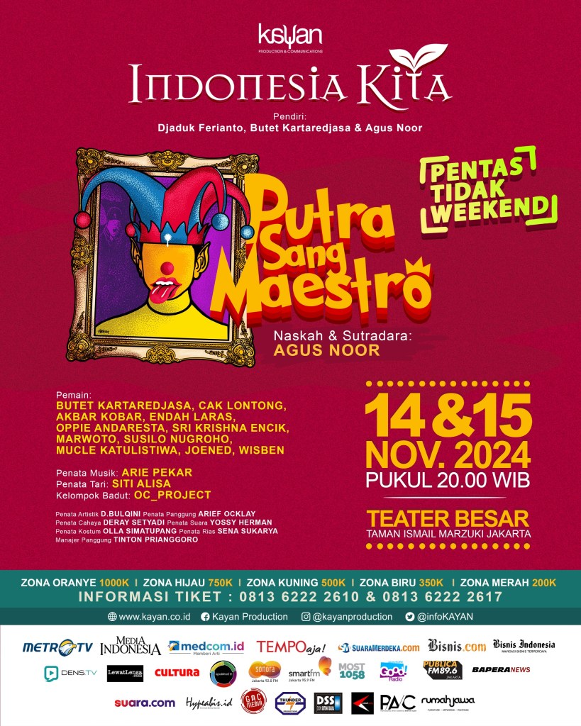 Pertunjukan ke-43 kali ini, Indonesia Kita menampilkan lakon berjudul “Putra Sang Maestro” yang naskahnya ditulis oleh Agus Noor. Lakon ini akan dipentaskan di Teater Besar Taman Ismail Marzuki Jakarta pada Kamis (14 November 2024) dan Jumat (15 November 2024). Disutradarai oleh Agus Noor, pertunjukan ini akan menampilkan para pemain Butet Kartaredjasa, Cak Lontong, Akbar Kobar, Endah Laras, Oppie Andaresta, Sri Krishna Encik, Mucle Katulistiwa, Marwoto, Susilo Nugroho, Wisben, dan Joened. Penampilan para aktor dan aktris ini akan diiringi musik yang diaransemen oleh Arie Pekar dan dimeriahkan gerak tari yang dikoreografi oleh Siti Alisa.