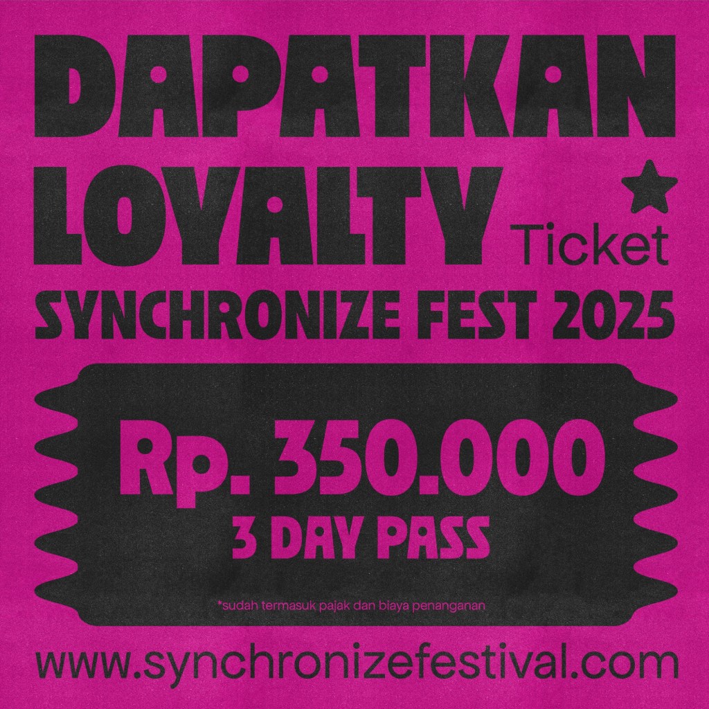 Bersamaan dengan siaran pers ini, Synchronize Fest juga menginformasikan jadwal penjualan tiket LOYALTY TICKET 2025 – 3 Day Pass yang secara resmi telah dibuka pada tanggal 3 Desember 2024 melalui website http://www.synchronizefestival.com. Penjualan tiket Loyalty Ticket dibanderol dengan harga Rp.350.000 (sudah termasuk pajak dan biaya penanganan) diperuntukan untuk warga-wargi (sebutan bagi para pecinta Synchronize Fest).
