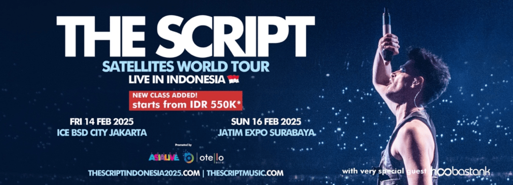 Bergabunglah bersama kami dalam perayaan musik yang spektakuler dengan The Script dan Hoobastank. Dua minggu lagi, kita akan bersama-sama dalam euforia musik yang tak terlupakan. Sampai jumpa di konser The Script Satellites World Tour 2025 di Jakarta dan Surabaya!.