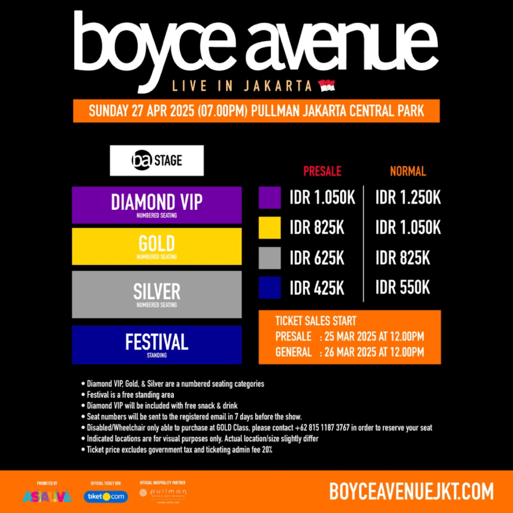 Boyce Avenue Live in Jakarta 2025 dipromotori oleh Color Asia Live. Jangan lewatkan momen spesial ini! Tiket Presale akan mulai dijual melalui tiket.com pada hari Selasa, 25 Maret 2025 mulai pukul 12.00 WIB dan General Sale dapat diperoleh mulai Rabu, 26 Maret 2025 pukul 12.00 WIB.