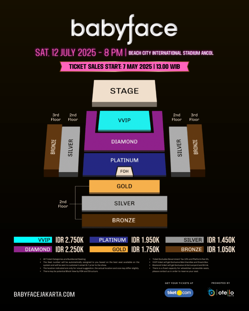 Berikut harga tiket Babyface di Jakarta, tiket dapat diperoleh mulai hari Rabu, 07 Mei 2025 pukul 13.00 WIB melalui babyfacejakarta.com