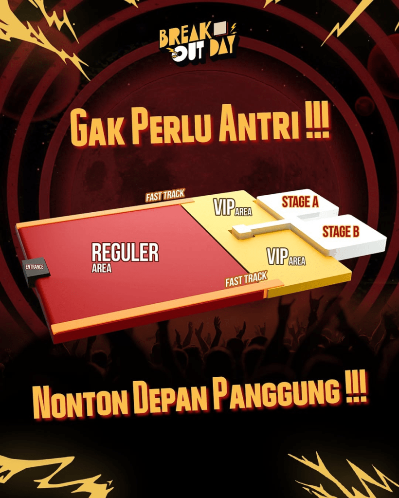 Tiket Break Out Day 2025 tersedia melalui situs resmi breakoutdayfest.id dan flotix.id dalam kategori berikut: