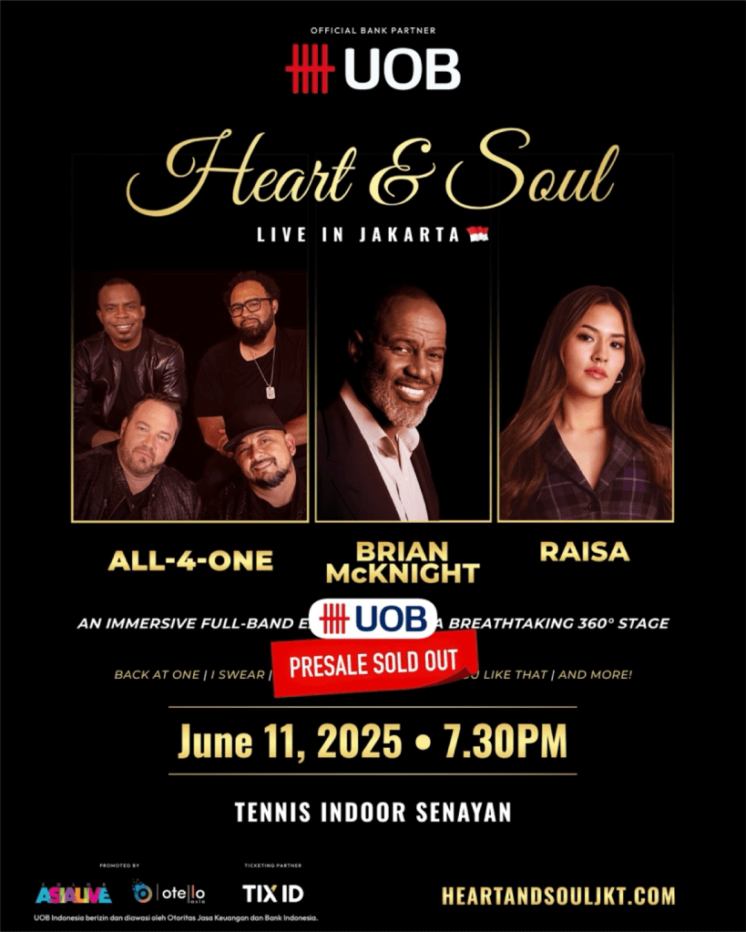 LewatLensa.com – Color Asia Live bersama Otello Asia dengan bangga mengumumkan bahwa tiket Presale UOB untuk konser “Heart & Soul Live in Jakarta 2025” telah habis (Sold Out). Konser ini, yang didukung oleh UOB sebagai Official Bank Partner, akan digelar pada Rabu, 11 Juni 2025 di Tennis Indoor Senayan, Jakarta, mulai pukul 19.30 WIB. Konser ini akan menampilkan penampilan spektakuler dari All-4-One, Brian McKnight, dan Raisa, menjadi “Super Group” yang hanya bisa disaksikan dalam satu panggung di Heart & Soul Live in Jakarta 2025.