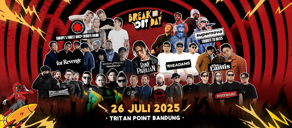 Break Out Day 2025 siap memecah suasana dengan dentuman music desibel tinggi, hentakan penuh tenaga, dan aura kebebasan positif yang memukau. Jadilah bagian dari sejarah festival musik paling garang di Indonesia, datang dan saksikan langsung untuk menjadi bagian dari kemeriahannya, karena hanya mereka yang berani yang akan merasakan hentakan energi sejati! Untuk info dan update terkini ikuti laman Instagram @breakoutdayfest