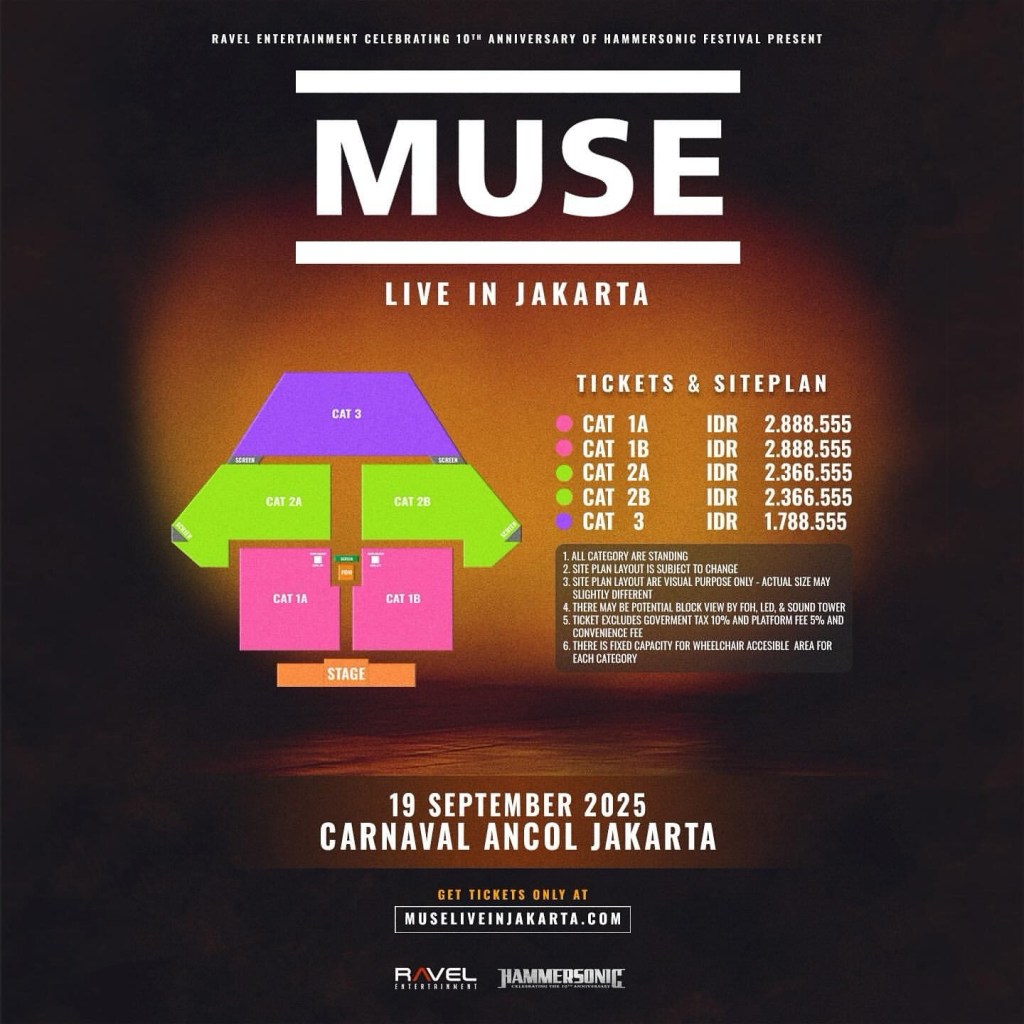 Mash dalam rangkaian acara menuju puncak Hammersonic Festival 10th Anniversary, Ravel Entertainment dengan bangga mengumumkan bahwa MUSE akan menggelar pertunjukan akbarnya di Indonesia, tepatnya ditanggal 19 September 2025 yang bertempat di Carnaval Ancol, Jakarta.