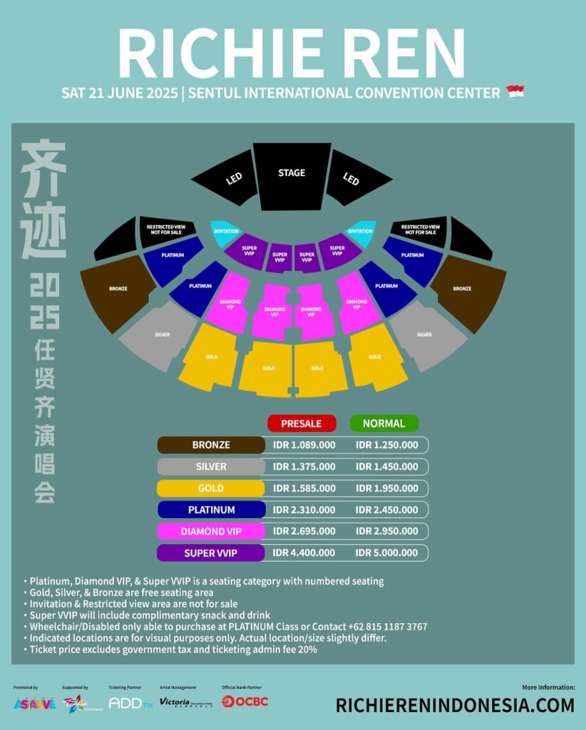 Berikut adalah Seatplan dan harga tiket yang tersedia untuk konser ini: