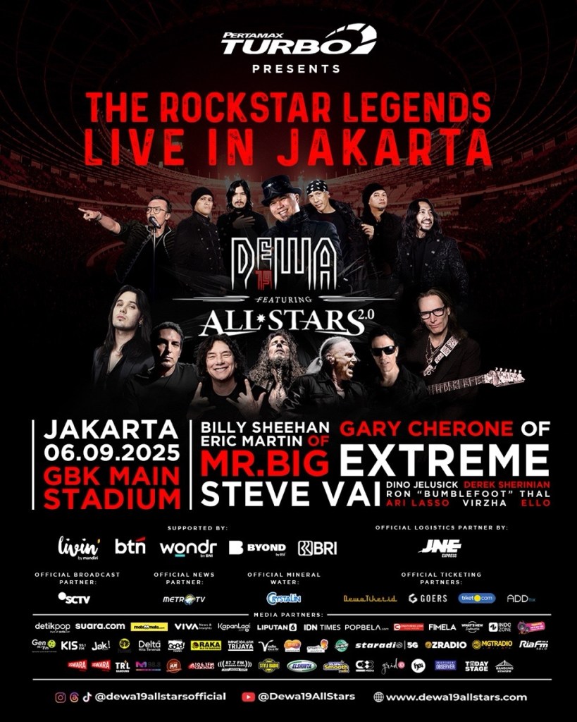 Jangan lewatkan kesempatan untuk menjadi bagian dari konser bersejarah ini. Catat tanggalnya dan bersiaplah untuk sebuah malam yang penuh dengan energi, musik yang luar biasa, dan kenangan yang tak terlupakan dari PERTAMAX TURBO PresentsThe Rockstar Legends Live in Jakarta – DEWA19 Featuring All Stars 2.0 pada tanggal 6 September 2025. Konser ini bukan hanya sebuah pertunjukan konser, tetapi sebuah perayaan musik yang akan dikenang sepanjang masa sebagai ‘legacy sejarah’luar biasa dari salah satu grup musik terbaik di Indonesia DEWA19.