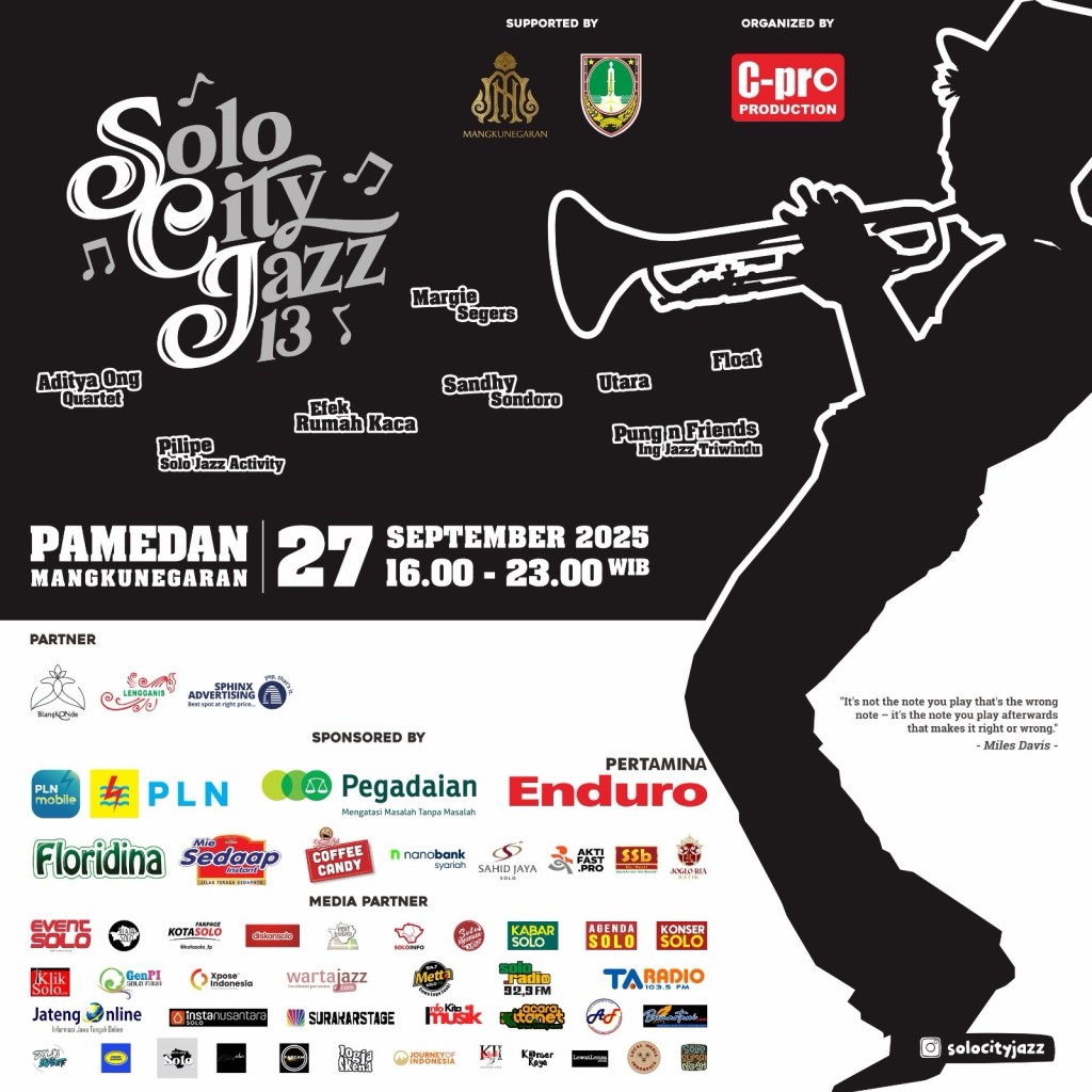 LewatLensa.com – Jazz kembali merasuk ke denyut kota Solo. Di halaman megah Pamedan Pura Mangkunegaran, musik, cahaya, dan semangat kebersamaan berpadu dalam gelaran Solo City Jazz ke-13. Digelar pada akhir pekan, Sabtu 27 September 2025, dimulai sejak pukul 16.00 WIB hingga larut malam, festival ini bukan sekadar pertunjukan musik, melainkan sebuah perayaan rasa—antara nostalgia, inovasi, dan cinta pada jazz yang terus tumbuh di Kota Bengawan.