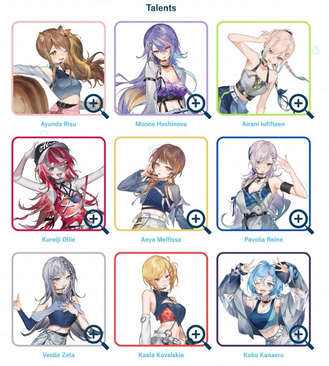 Ayunda Risu / Moona Hoshinova / Airani Iofifteen / Kureiji Ollie / Anya Melfissa / Pavolia Reine / Vestia Zeta / Kaela Kovalskia / Kobo Kanaeru