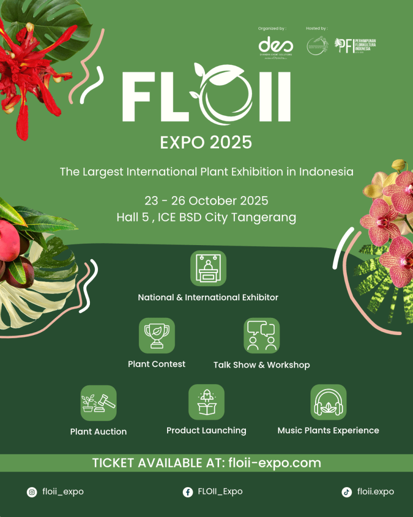 LewatLensa.com – Pameran tanaman berskala internasional Floriculture Indonesia International (FLOII) Expo 2025 mengangkat tema besar tahun ini melalui kampanye DimulaiDariSatu: Satu Tanaman untuk Masa Depan. Acara yang akan digelar pada 23–26 Oktober 2025 di Hall 5, ICE BSD City ini diharapkan menjadi ruang pertemuan bagi pelaku industri, komunitas, dan pecinta tanaman dari berbagai kalangan untuk merayakan keindahan sekaligus mengangkat nilai fungsi dan masa depan dunia tanaman.
